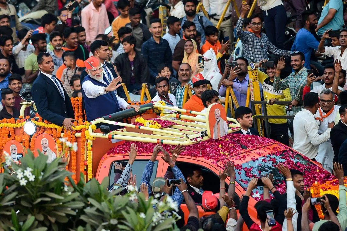 India’s PM Narendra Modi greeting supporters during a rally in Ahmedabad on Dec 1, 2022.