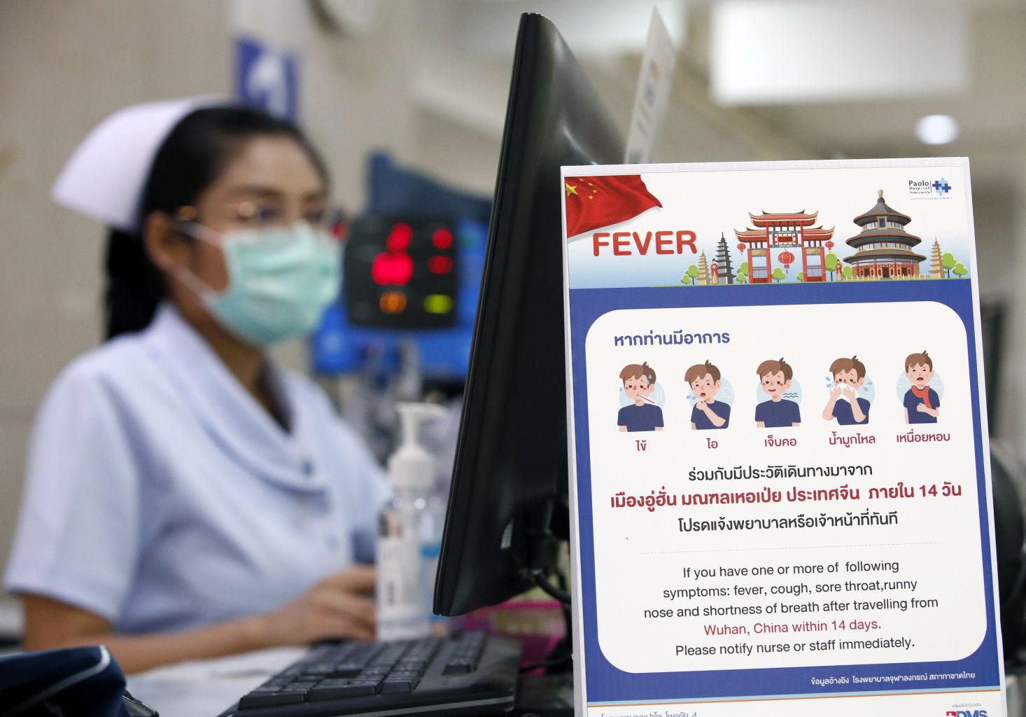 A Thai nurse works next to a campaign poster alerting people to the coronavirus at a hospital in Bangkok.