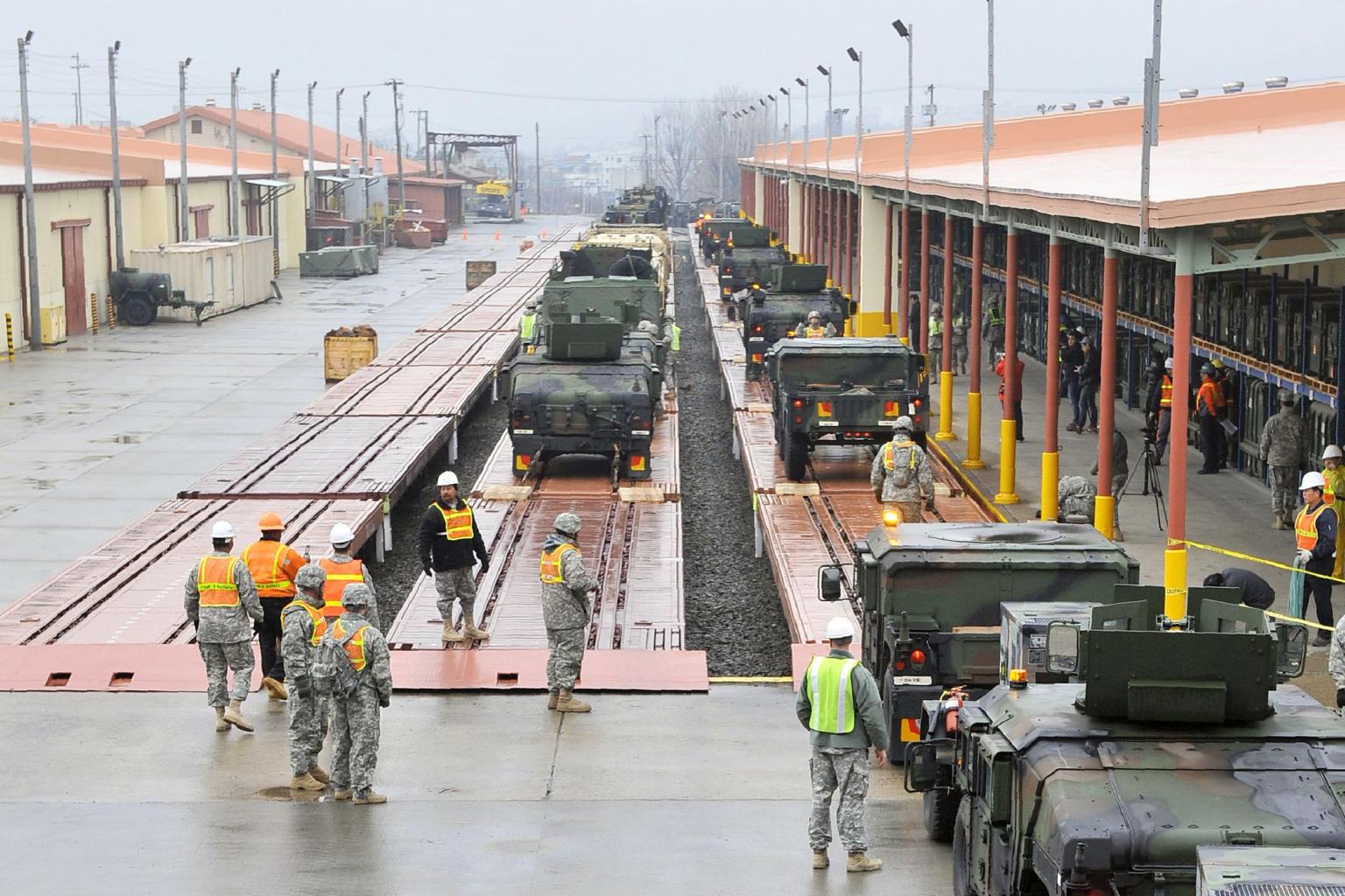 In a photo taken on March 6, 2012, US military vehicles are driven onto a train during an operation at Camp Carroll in Chilgok, 220 kms southeast of Seoul.