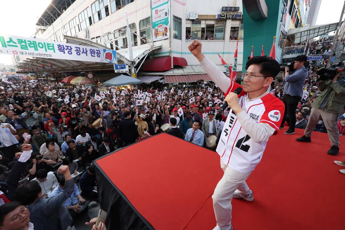 Mr Kim Moon-soo from the conservative People Power Party at a campaign rally at a traditional market in Daegu, South Korea, on May 12.