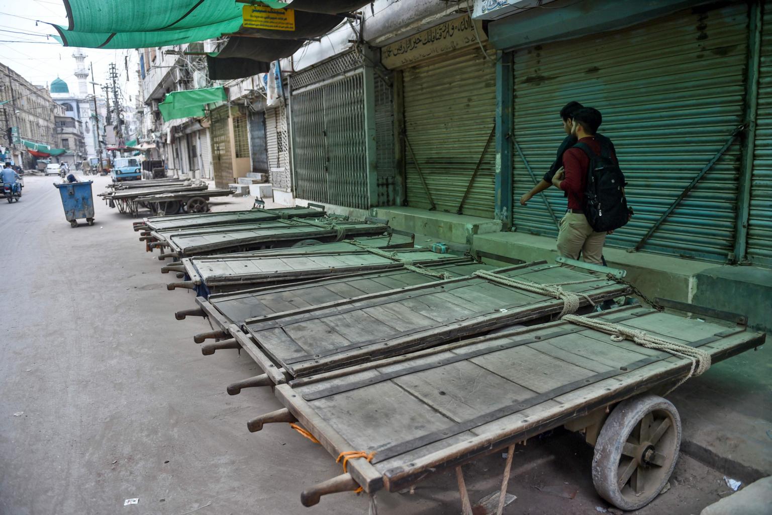 Men walk past the shuttered market during the countrywide traders strike in Karachi on Oct 29, 2019. Last year's record high fiscal deficit of 8.9 per cent of GDP was the result of unrealistic targets set by an outgoing government, according to the State Bank of Pakistan.