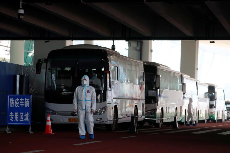 A staff member in protective suit standing next to buses before the expected arrival of a World Health Organisation (WHO) team tasked with investigating the origins of the coronavirus disease, at Wuhan Tianhe International Airport in Wuhan, Hubei province, China on Jan 14, 2021.