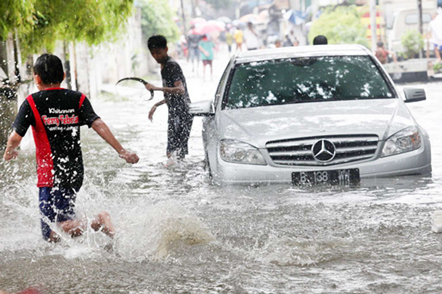 Children play in floodwaters near a stranded a car in Tanjung Duren, West Jakarta, on Jan 31, 2015.