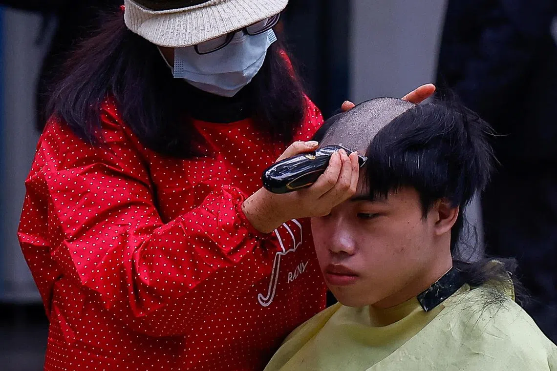 A new recruit having his hair shaved as he began his one-year compulsory military service in Taiwan.