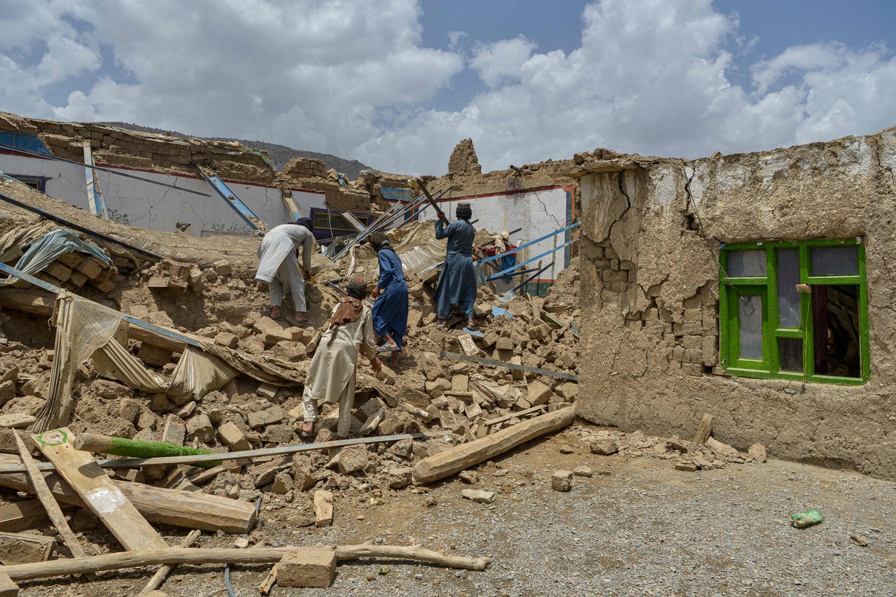 Afghan men look for their belongings amid the ruins of a damaged house damaged in Paktika province on June 23, 2022.