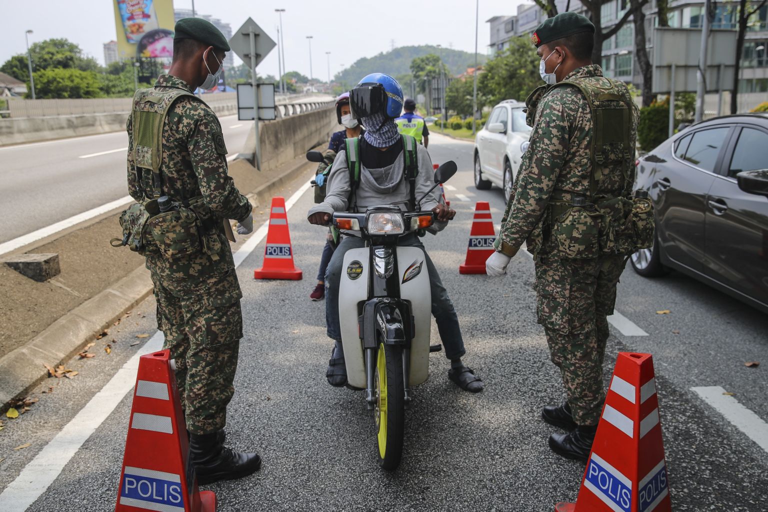 Malaysia soldiers stop vehicles at a roadblock as the military are deployed to help enforce the movement control order in Kuala Lumpur on March 22, 2020.