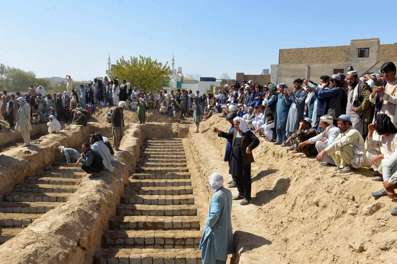 People gather for the burial of victims of a mosque attack at a graveyard in Kandahar, Afghanistan on Oct 16, 2021.