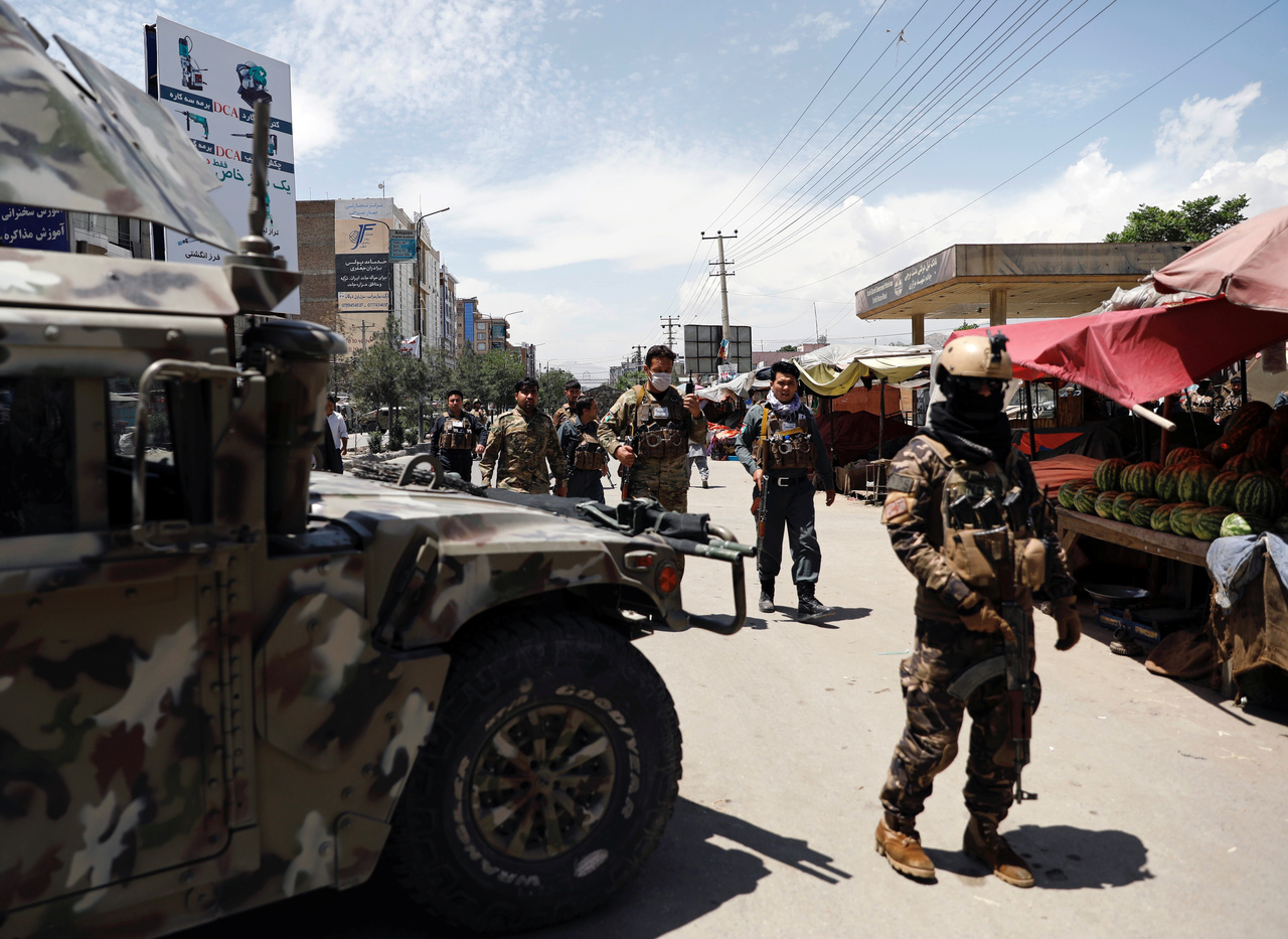 Afghan security forces arrive at the site of an attack in Kabul on May 12, 2020.