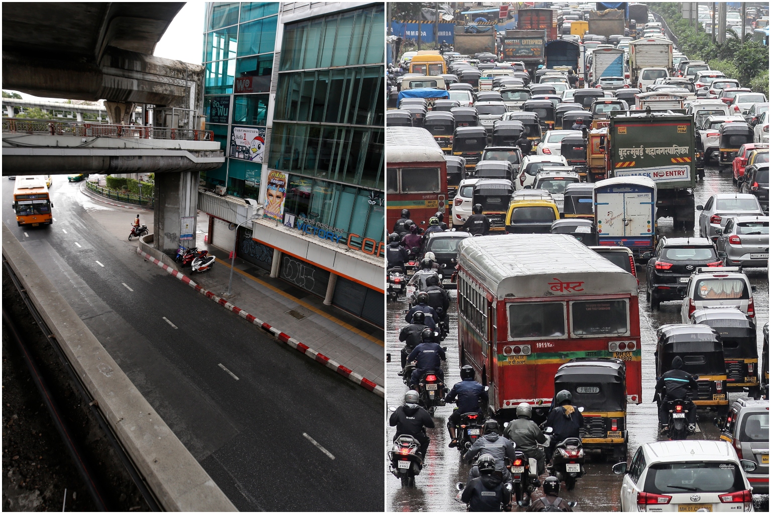 Emptier streets seen in Bangkok (left) and a traffic jam in Mumbai.