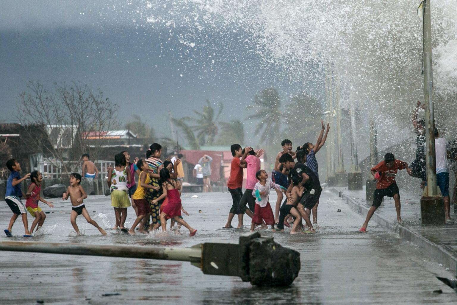 A handout photo made available by Greenpeace-Philippines shows children splashed by strong waves along a dike in the aftermath of Typhoon Kammuri in Legazpi city, Albay Province, Philippines, on Dec 3, 2019.