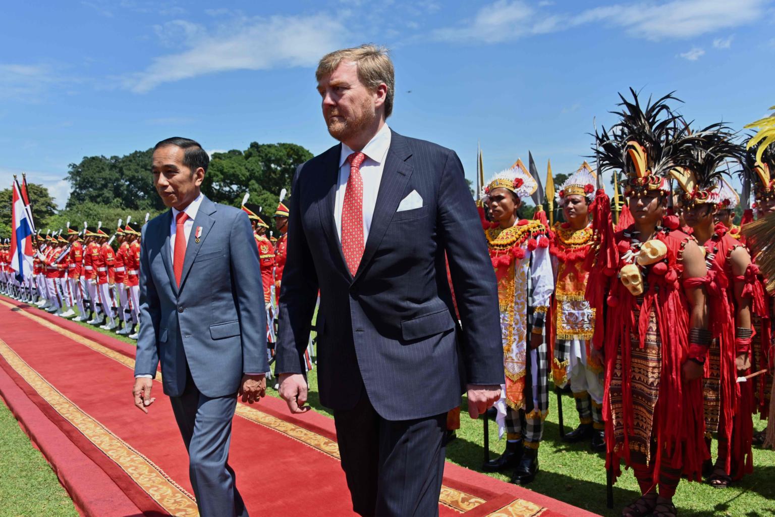Dutch King Willem-Alexander (right), accompanied by Indonesian President Joko Widodo, inspects a guard of honour at the Bogor presidential palace in Bogor, Indonesia, on March 10, 2020.