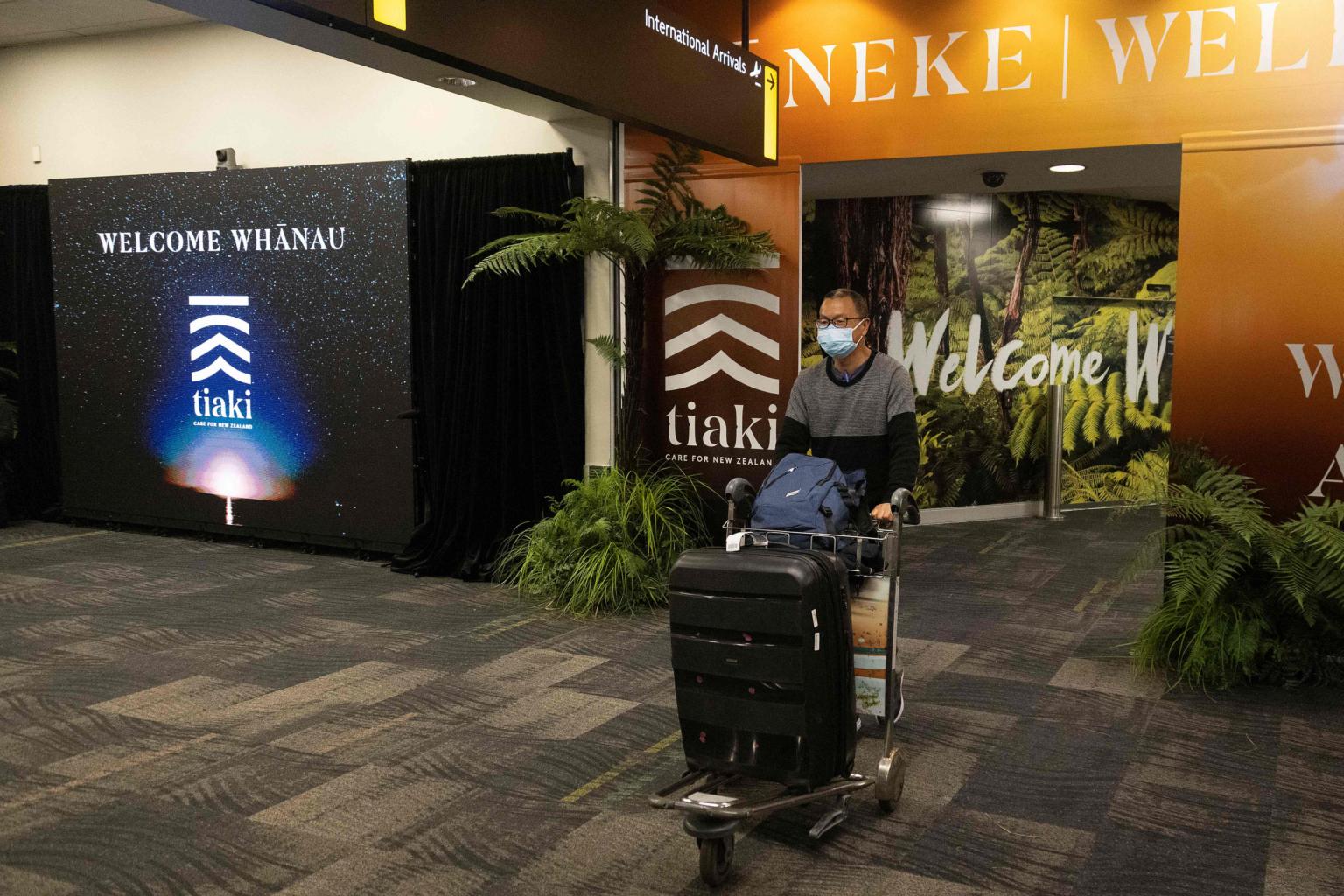 In a photo taken on April 19, 2021, a traveller arrives on the first flight from Sydney, in Wellington.