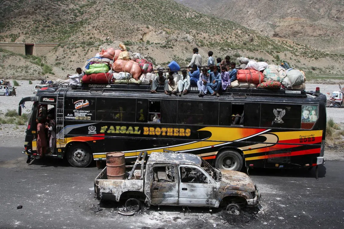 A bus driving past a damaged vehicle, a day after separatist militants conducted deadly attacks in Pakistan’s restive Balochistan province.