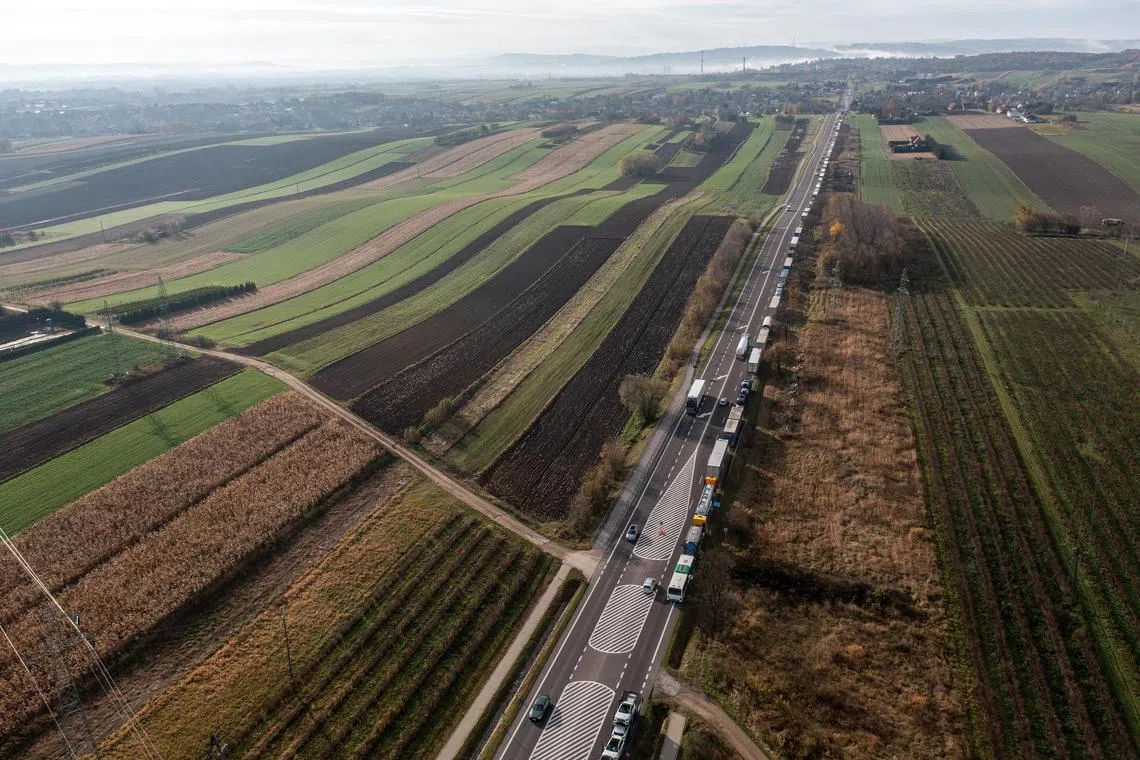 A queue of trucks stands on the road in Przemysl, south-east Poland, waiting to cross the Polish-Ukrainian border in Medyka.