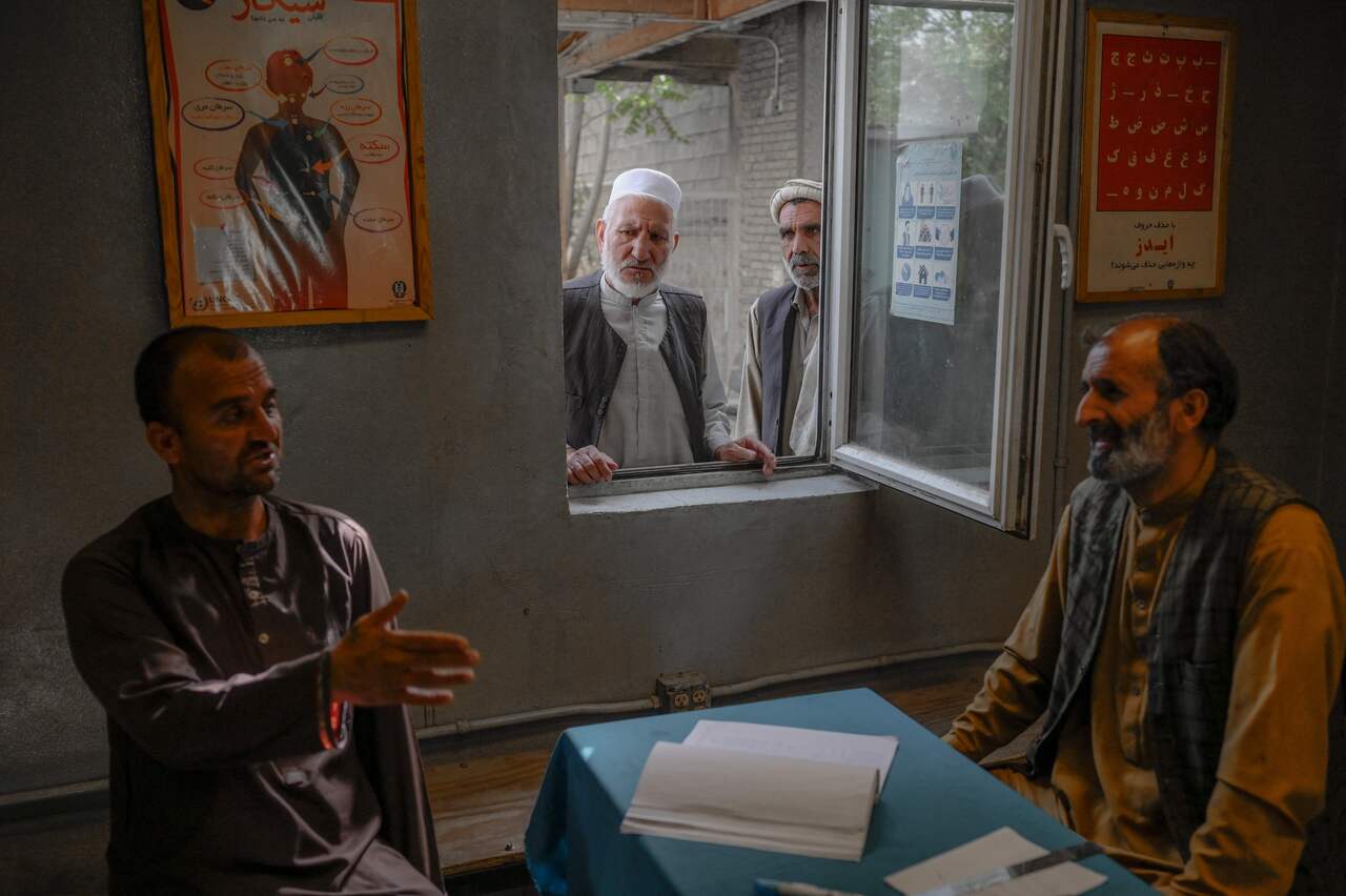 <p>This picture taken on October 10, 2021 shows a newly arrived drug addict trying to convince an officer to leave the hospital as his relative members watch him from outside the window at the Avicenna Medical Hospital for Drug Treatment in Kabul. - With shaved heads, oversized tunics and the frightened gaze of hunted animals, the drug addicts rounded up by the Taliban brace for 45 days of painful and anxiety-ridden withdrawal. (Photo by BULENT KILIC / AFP) / TO GO WITH'AFGHANISTAN-SOCIAL-POLICE-DRUGS, SCENE by Michel MOUTOT</p>
