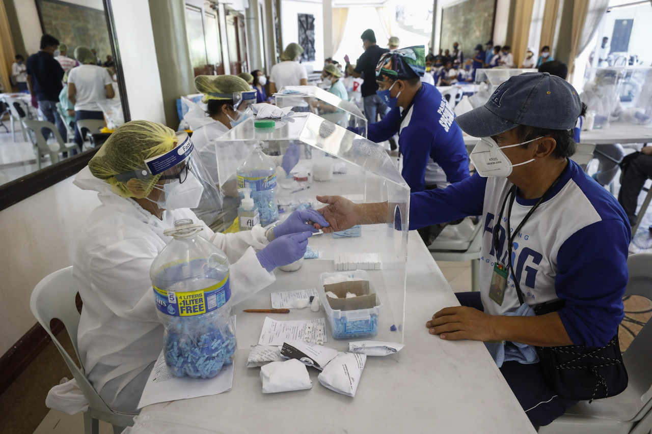 A city worker (right) wears a face mask while submitting a blood sample at a coronavirus testing center in Pasig City, Philippines on May 27, 2020.
