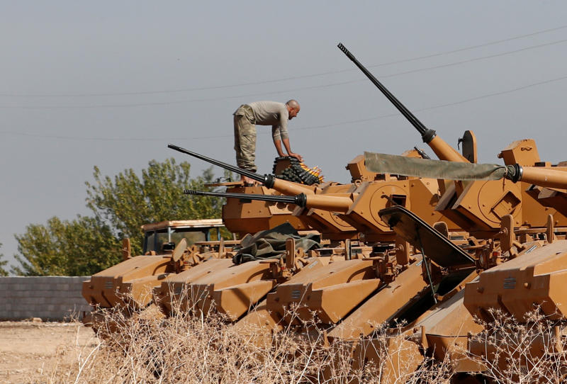 A Turkish soldier stands on top of an armoured personnel carrier near the Turkish-Syrian border in Sanliurfa, Turkey, on Oct 15, 2019.