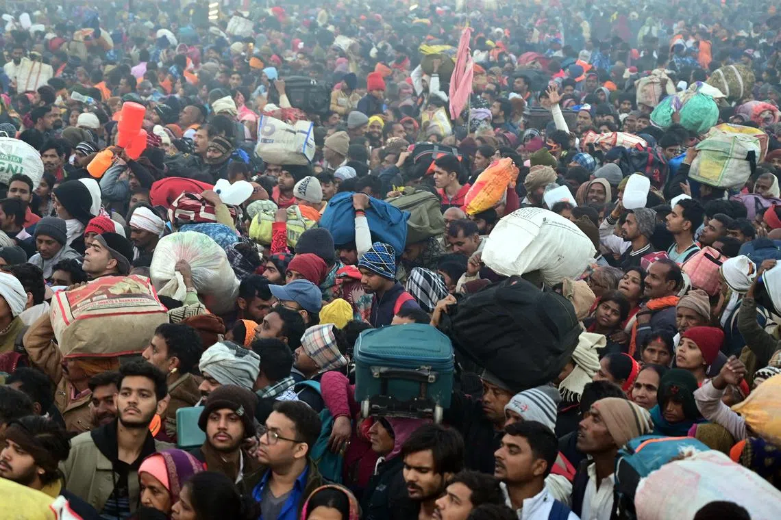 Hindu devotees carrying their belongins gather near the site of a stampede during the Kumbh Mela festival near Sangam Ghat in Prayagraj, northern state of Uttar Pradesh, India, on Jan 29.