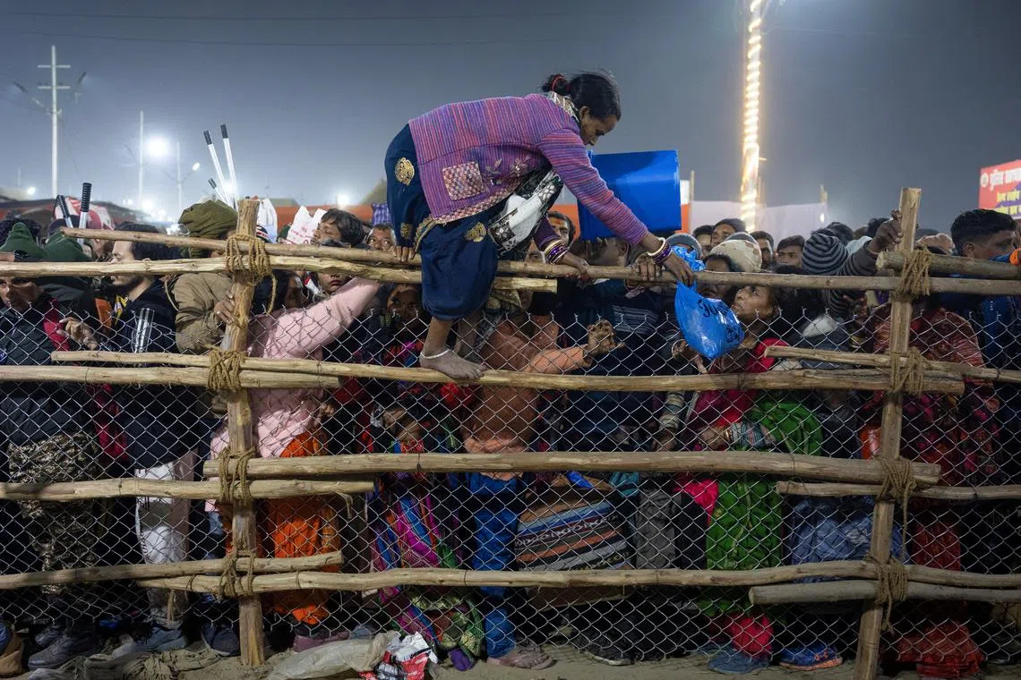 A devotee crosses over a barricade, after a deadly stampede before the second “Shahi Snan” (royal bath), at the Maha Kumbh Mela in Prayagraj, India, on Jan 29.