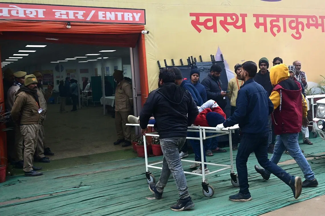 Injured people are transferred to a hospital following a stampede accident during the Kumbh Mela festival near Sangam Ghat Prayagraj, Uttar Pradesh, India, on Jan 29.