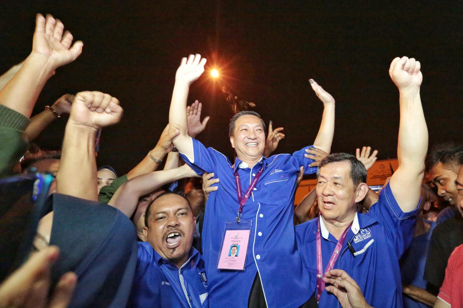 In a photo taken on Nov 16, 2019, Datuk Seri Wee Jeck Seng (centre), from the opposition Barisan Nasional coalition, celebrates his victory in the Tanjung Piai by-election in Johor state.