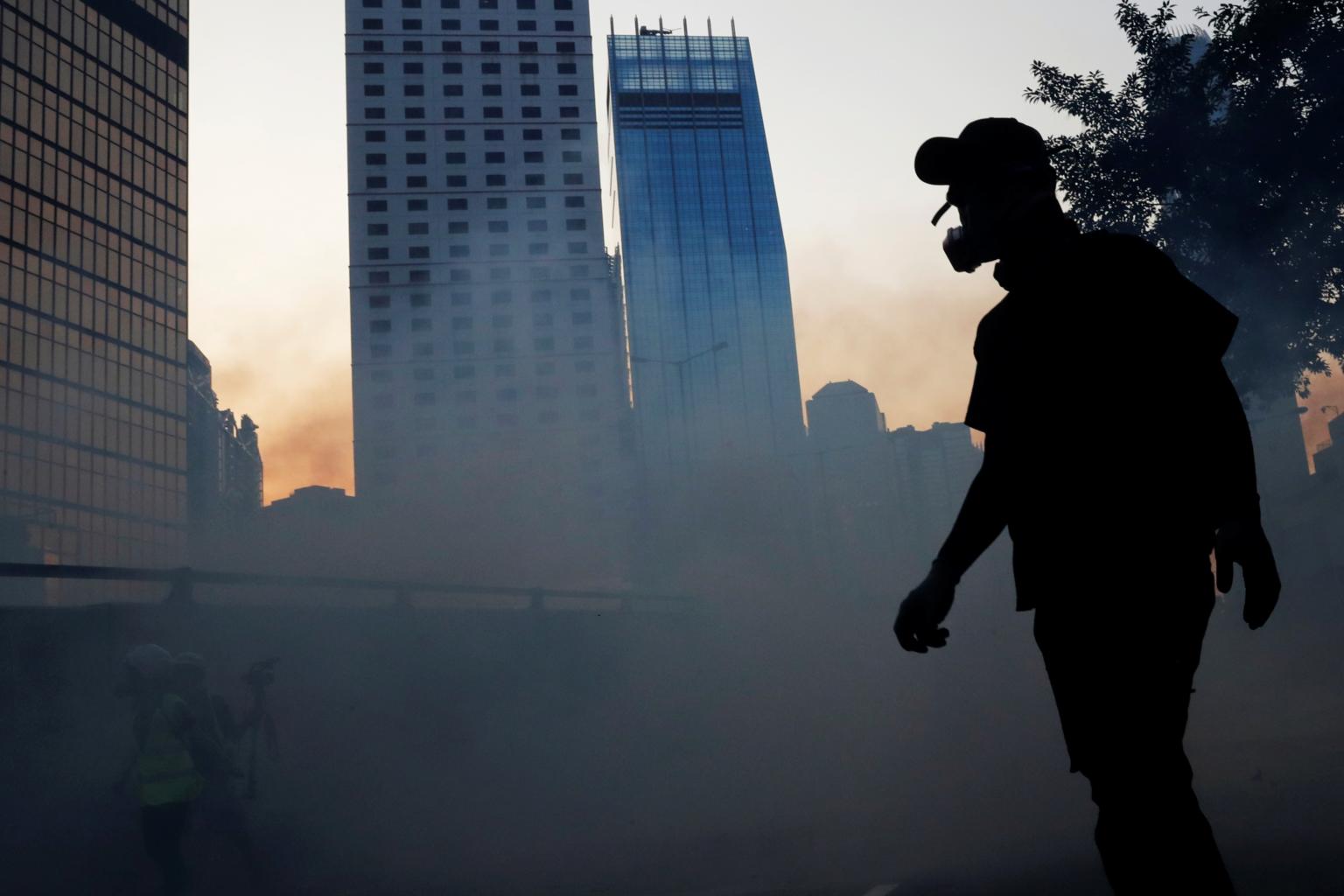An anti-government protester is silhouetted against the skyline during a demonstration near Central Government Complex in Hong Kong on Sept 15, 2019.