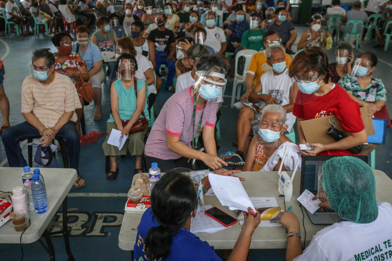 Elderly residents wait for their turn to get the AstraZeneca vaccine against Covid-19 in Manila on March 30, 2021.