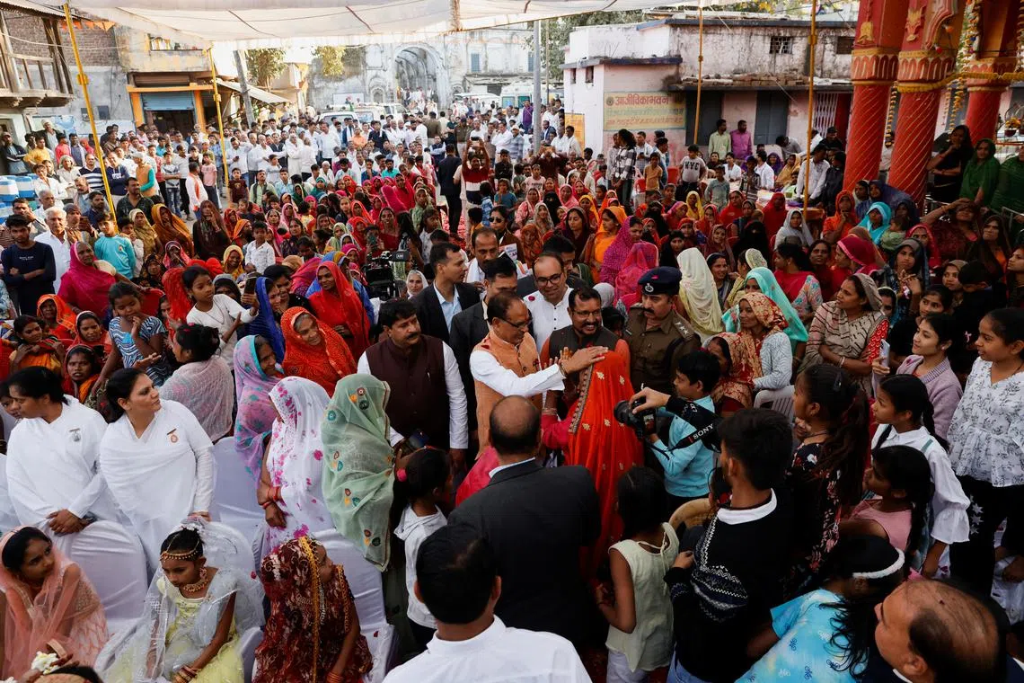 Senior Bharatiya Janata Party (BJP) leader Shivraj Singh Chouhan (centre) reacts as women greet him at an event in the village Ladkui near Bhopal, India, on Feb 8.