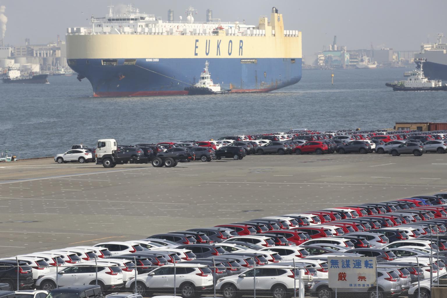 A photo from March 5, 2019, shows cars for export parked at a port in Yokohama, near Tokyo.