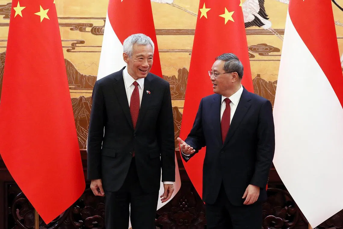 Prime Minister Lee Hsien Loong (left) with China Premier Li Qiang at the Great Hall of the People on April 1.