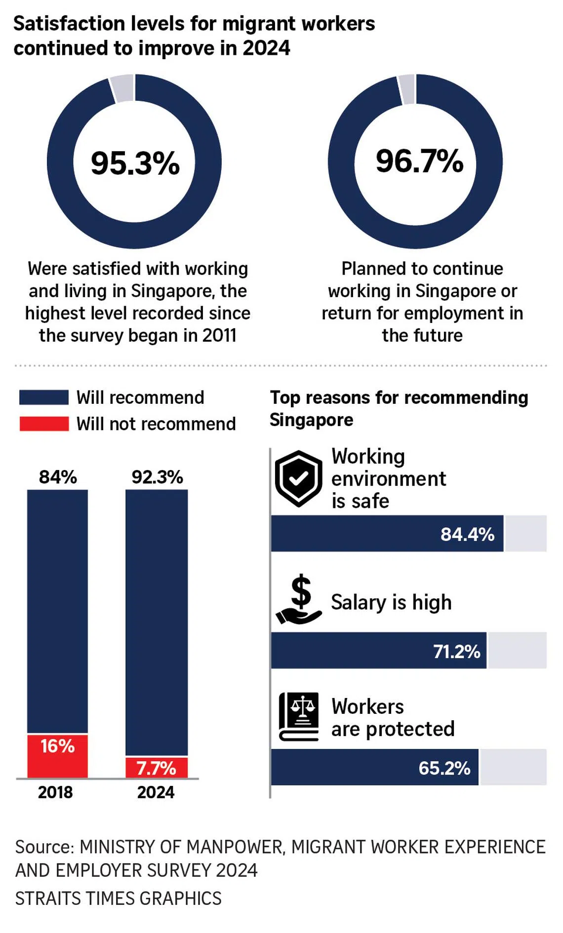 Most migrant workers would recommend Singapore as a place to work, a sentiment that has grown stronger. In 2024, 92.3 per cent said they would recommend Singapore to their friends and relatives as a place to work, up from 84 per cent in 2018.