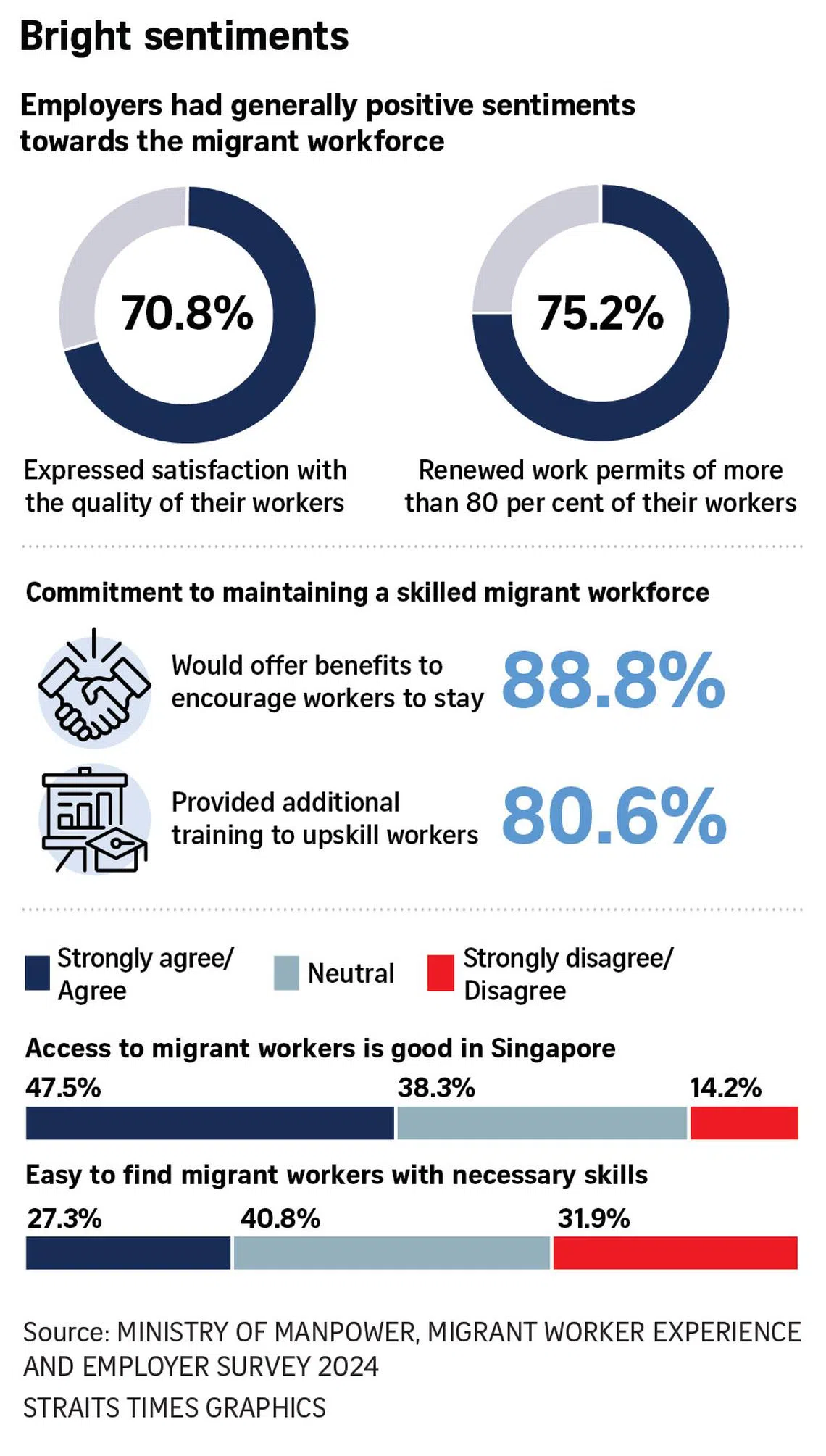 - MOM survey reveals 70.8% of employers are satisfied with migrant worker quality. Only 1.4% expressed dissatisfaction while the rest remained neutral.