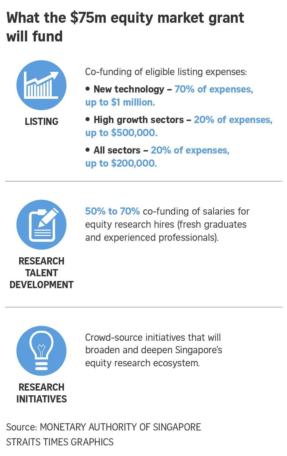 SINGAPORE - In a bid to raise Singapore's status as an enterprise financing hub, a $75 million grant has been launched to defray costs of enterprises hoping to list on the Singapore bourse, support research initiatives and subsidise the salaries of Singaporean equity research analysts.