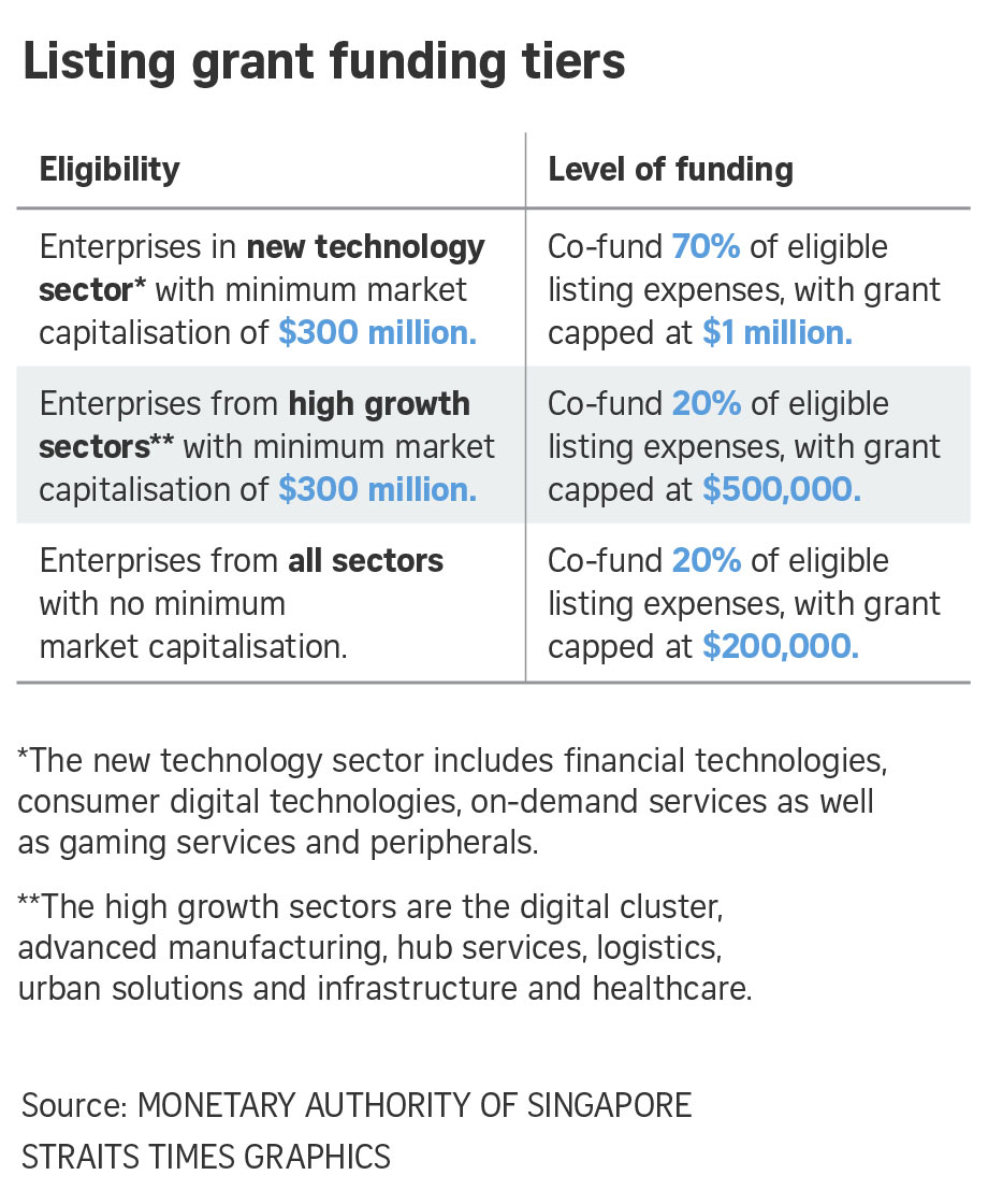 To support the fund-raising needs of companies when they choose to list on the SGX, a listing grant will be given out to eligible companies - including foreign enterprises but excluding real estate investment trusts and business trusts - helping to defray the costs involved, such as legal and underwriting fees.