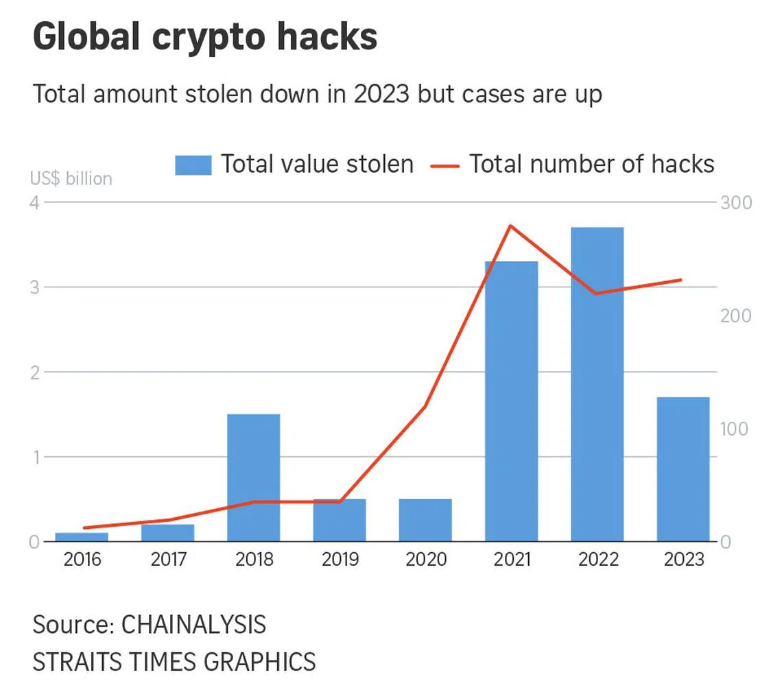 Global funds stolen via crypto hacking plunged by about 54.3 per cent to US$1.7 billion (S$2.2 billion) in 2023.
