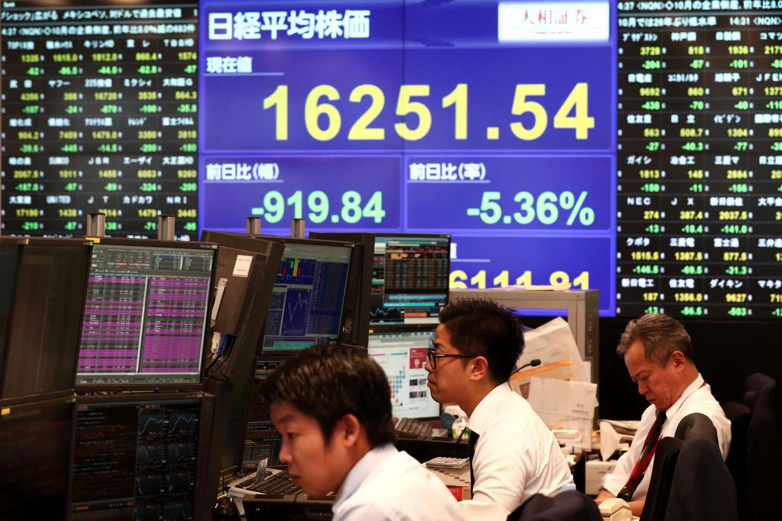 Employees of a stock security company work at their terminals as a screen displays the Nikkei index after the closure of the Tokyo stock exchange.