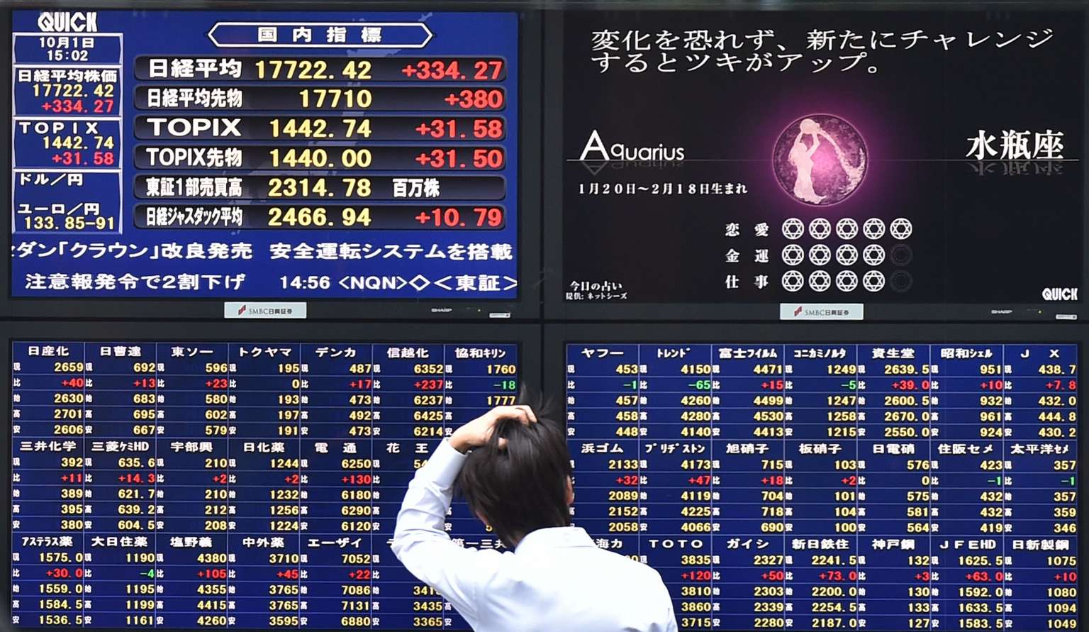 A man looking at an electronic board at the Tokyo Stock Exchange on Oct 1, 2015.