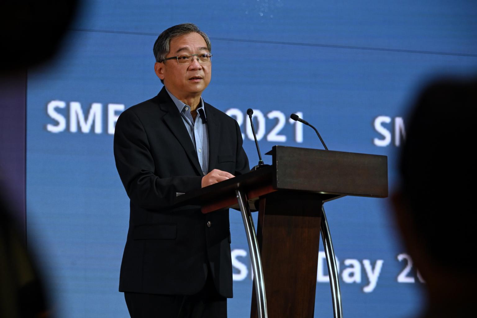 Minister for Trade and Industry Gan Kim Yong delivers his opening address at SME Day, on Nov 11, 2021.