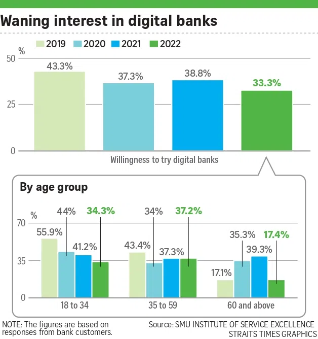 GXS Bank and Trust Bank, which cater to retail customers and operate entirely online, made their debut in 2022. Interest in digital banks has faded, especially among customers aged 18 to 34 and those 60 and above.