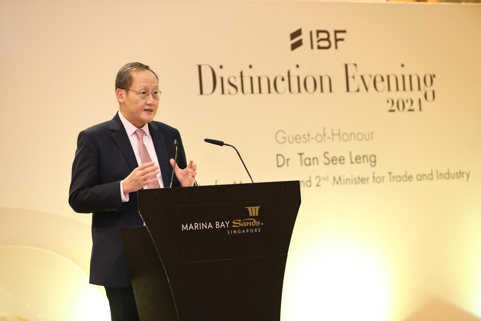 Dr Tan was speaking to a hybrid audience at IBF Distinction Evening 2021, where the Institute of Banking and Finance (IBF) presented awards to four financial institutions and 32 people.