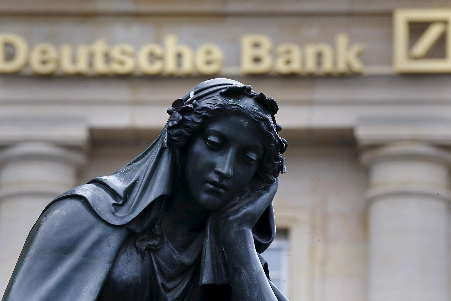 A statue is seen next to the logo of Deutsche Bank in Frankfurt, Germany.