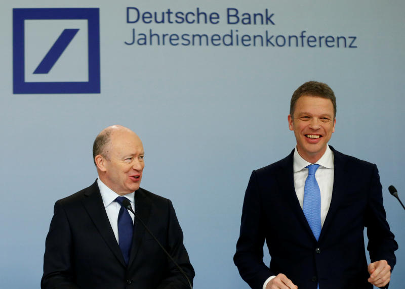 John Cryan, former chief executive of Deutsche Bank, and current CEO Christian Sewing attend the bank's annual news conference in Frankfurt, Germany, on Feb 2, 2018.