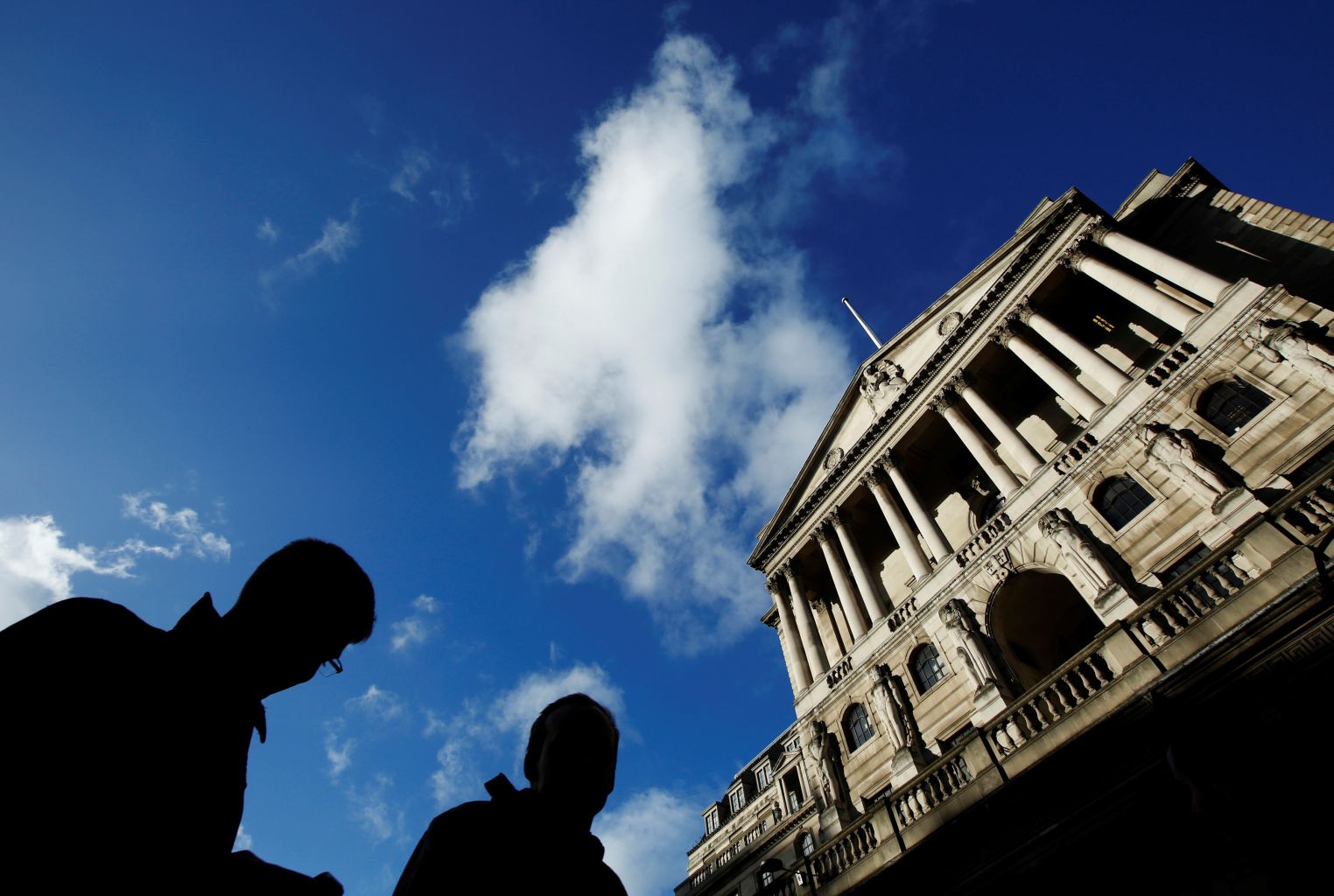 People pass the Bank of England in the City of London.