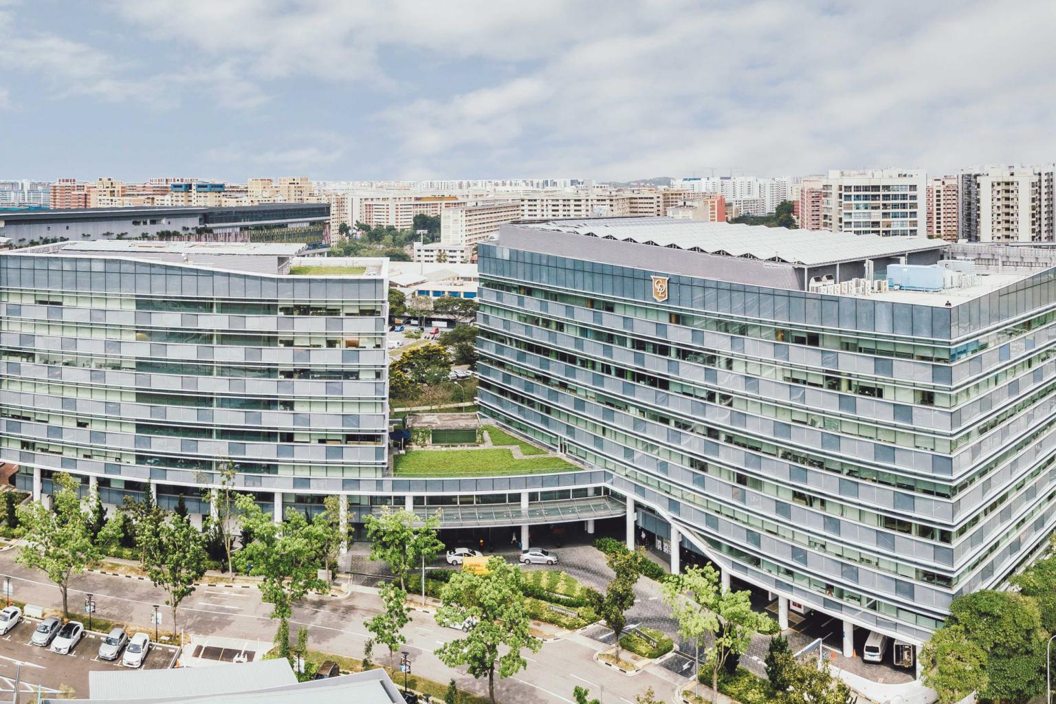 7 & 9 Tampines Grande Singapore, which comprise two blocks of eight-storey office towers linked by an entrance lobby with retail, as well as food and beverage outlets, on the ground floor.