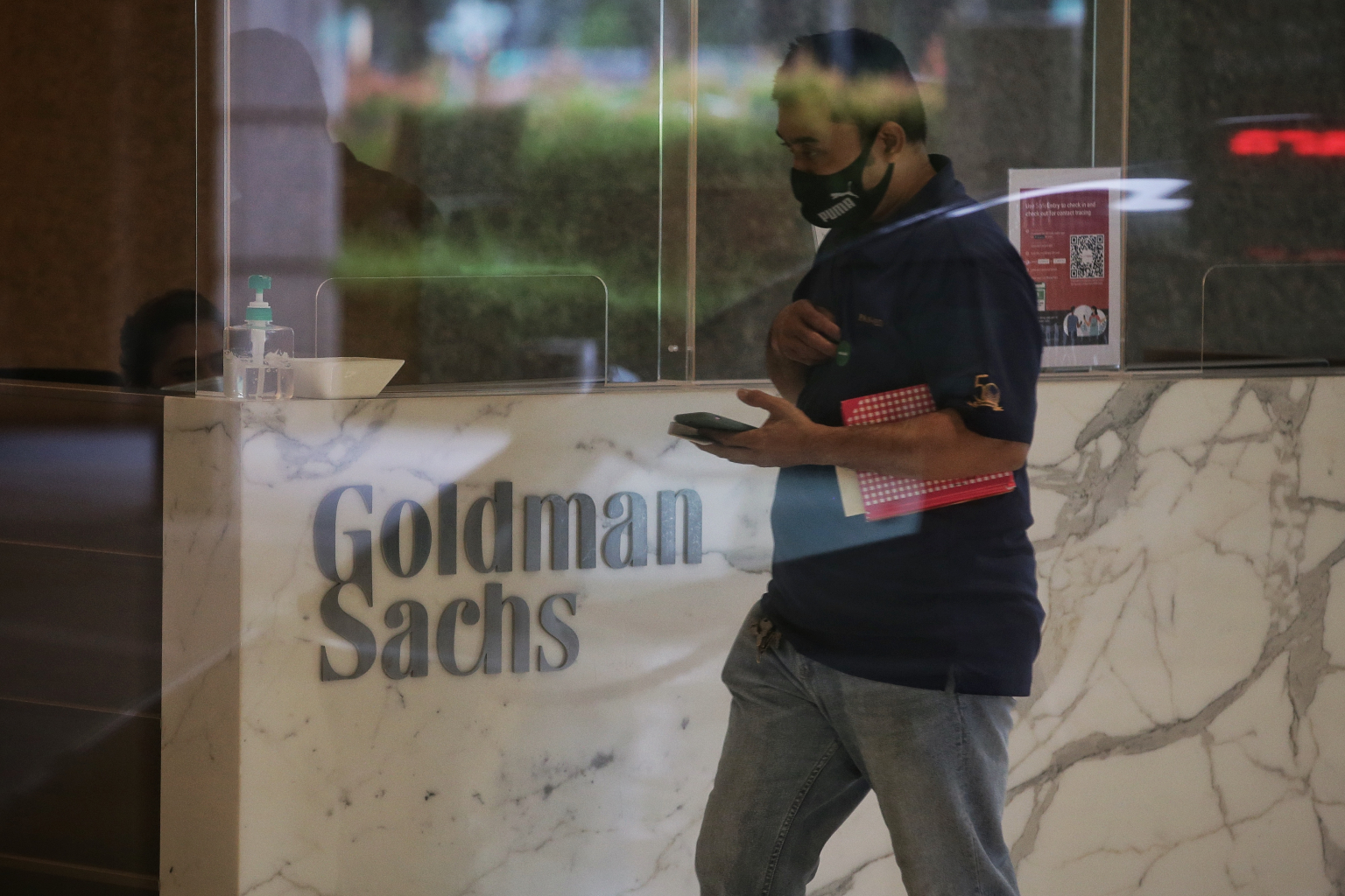 A man walks past the visitor registration counter for Goldman Sachs in the South Lobby of One Raffles Link on Oct 23, 2020.
