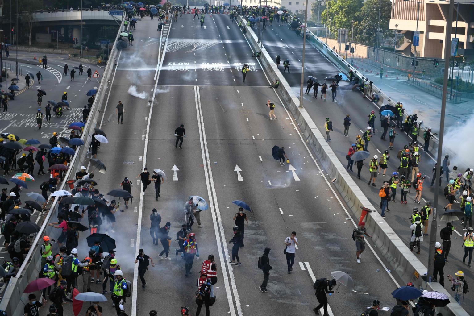 Hong Kong police fire tear gas from the central government offices towards protesters who have gathered in the streets in the Admiralty area on Oct 1, 2019.