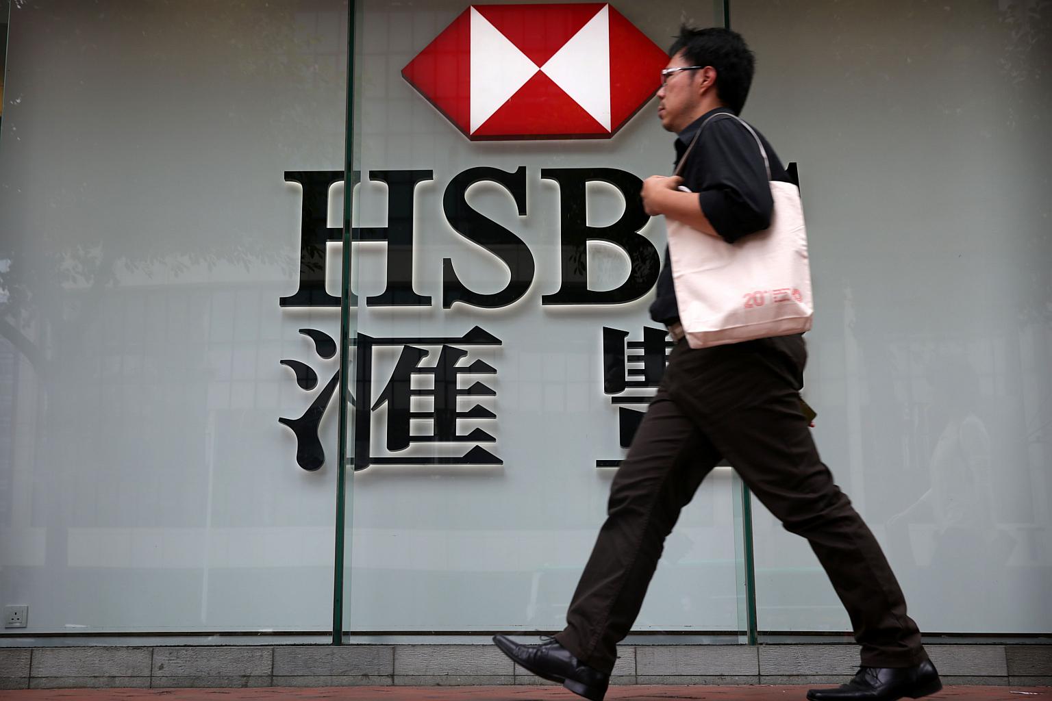 A pedestrian walks past a sign for the Hong Kong and Shanghai Banking Corporation (HSBC) bank in Hong Kong.