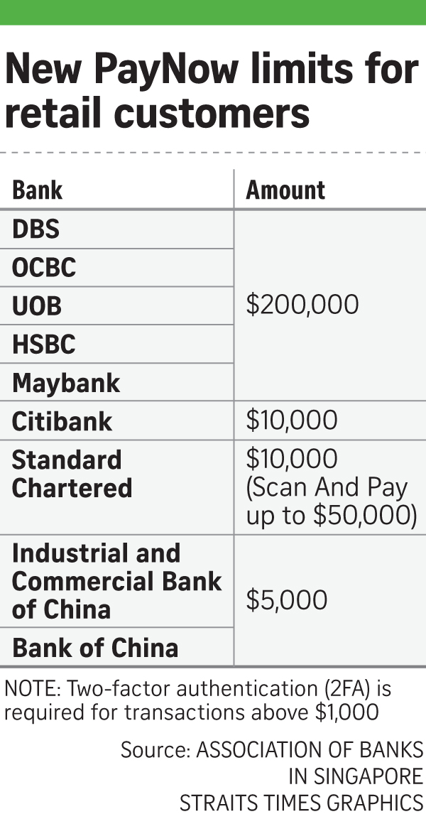 The transaction limit for retail customers has been raised to $5,000 for BOC and ICBC; $10,000 for Citibank and StanChart (with scan-and-pay transactions of up to $50,000 for StanChart); and $200,000 for UOB, DBS, HSBC, Maybank and OCBC.