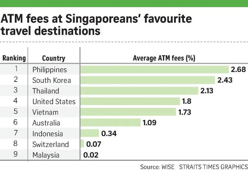 Average ATM fees in these countries range from 2.13 per cent to 2.68 per cent, said Wise, which ranked ATM fees at Singaporeans’ favourite destinations.