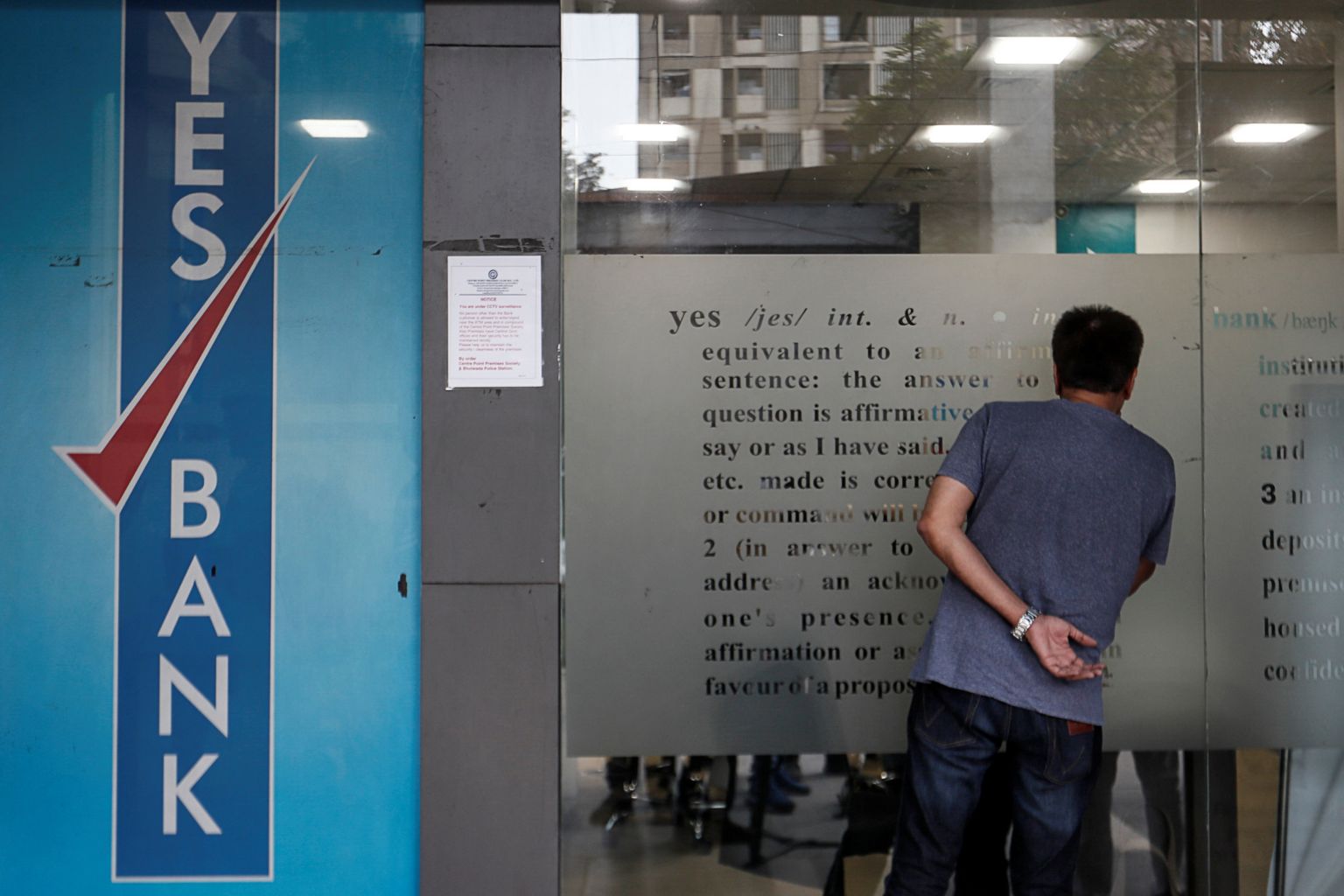 A customer tries to look into a Yes Bank branch in Mumbai, India, March 6, 2020.